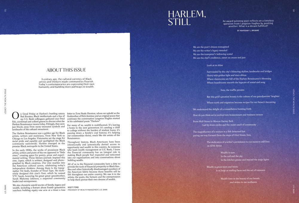 The series leverages the talents of Black award-winning writers, poets, journalists, photographers, illustrators, and even a typographer, to specifically do a few things: We wanted to build awareness around the impact and influence of the Harlem Renaissance and grant access and opportunity to a new generation of Black cultural thinkers, which we’re really doing in our culture zine. We also wanted to shine a light on Black affluence because that was a specific, targeted area that U.S. Bank wanted us to speak to, and show people that wealth shows up in a myriad of ways. People are building wealth differently today. It’s not just the financial wealth, but it’s also the intellectual capital, and the historical value that brings to bear when we’re talking about inheritance.