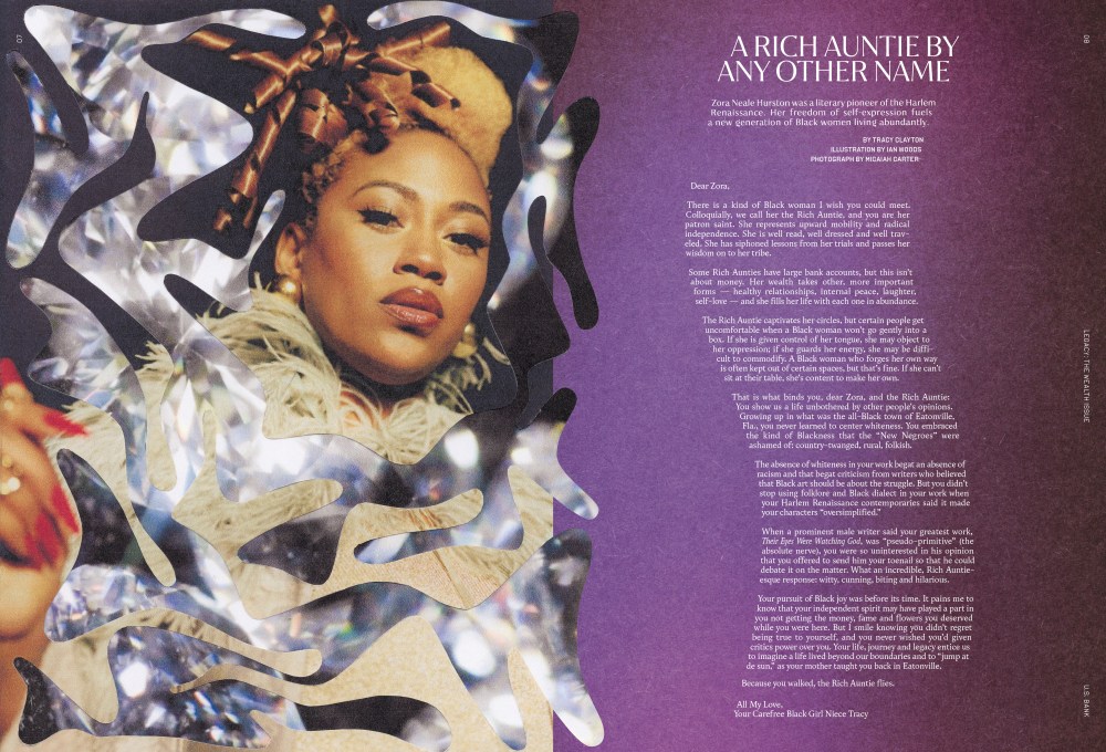 We had Mahogany L. Brown, the current poet-in-residence for the Lincoln Center, write a custom poem for the wealth zine, and she said that everything about this project just felt like home to her. Her marching orders were simple: I said, “If Langston Hughes talked about this idea of a “dream deferred,” how do we bring it forward and speak to what a dream fulfilled looks like?” So she took us to Harlem. She took us to education. She took us to inheritance. She took us to all of the places and spaces that Black folks lived in during the Harlem Renaissance and said this is where and how we’re succeeding today. I thought it was a beautiful nod to the Harlem Renaissance, and it really hit on all of the cylinders as it related to this storytelling.
