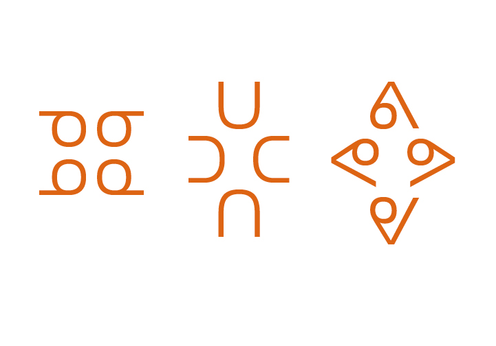 Left: A proof showing a comparison of the Lava Syllabics upright and cursive forms, in the Heavy master; Top right: An early sketch made by the author during the initial research phase of the project, exploring potential modulation structures that could be applied to the Lava Syllabics design; Bottom right: An example of the concept of rotation, which sits at the core functionality of Syllabics typography, for any language that uses the writing system.