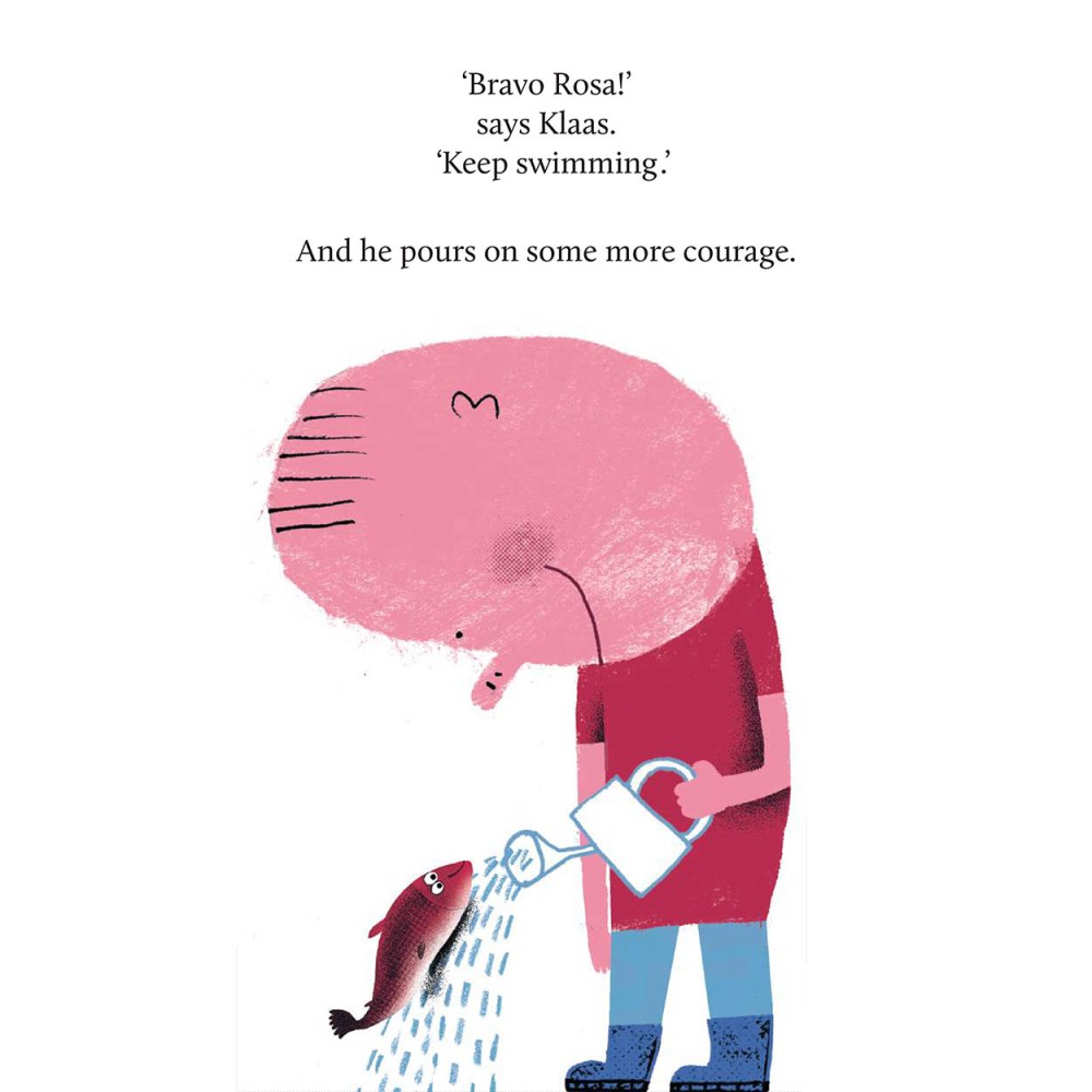 What is long, narrow and folds open from the top? It is ROSA: The Very Brave Salmon, a new book by Klaas Verplancke, in which a wild pink fish braves wild, rushing brooks, and is to be expected to start spawning. But also, in her existential quest, ROSA travels any way possible using human means, such as fire hose, child’s tears and watering can to reach her destination. All this so she can, at the end (and this is not a spoiler: she will die a salmon’s ritual death). Verplancke’s tale is one of endurance, courage, and the power of behavior in nature. Klaas offers more on his fishy tale below.