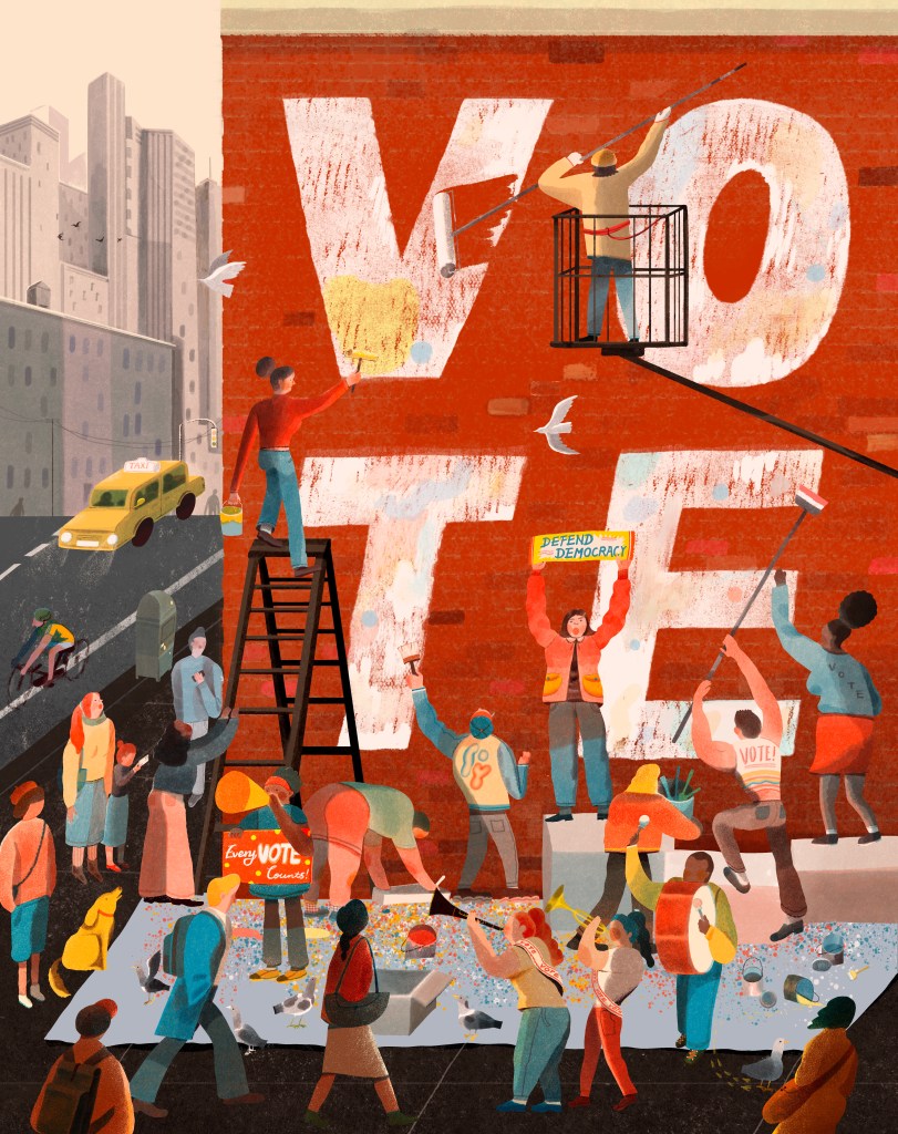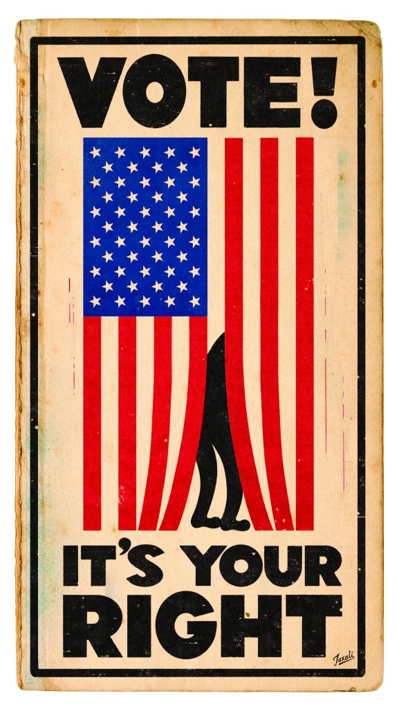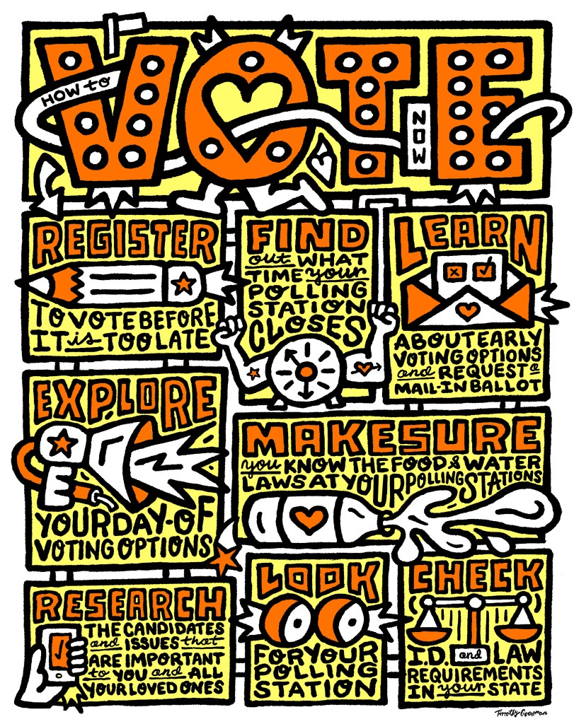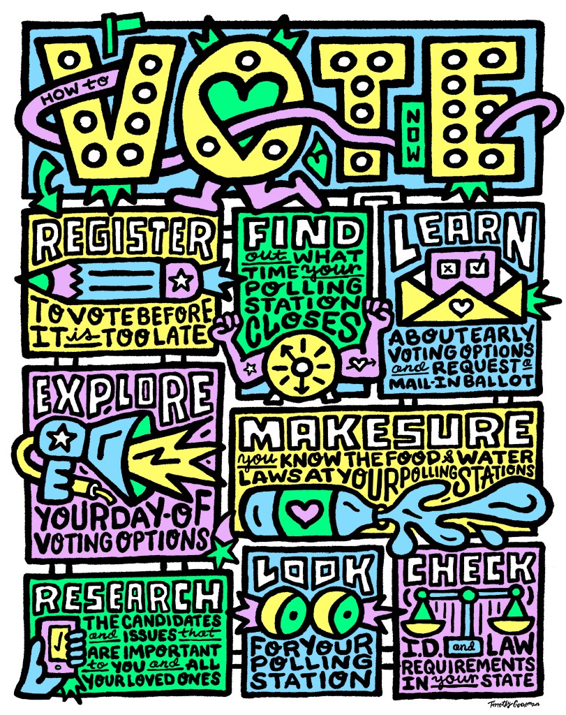 The Norman Rockwell Museum has launched The Unity Project 2024, a poster campaign to motivate people to vote. Distributed primarily through social media, the campaign features striking images and messages from six top contemporary illustrators who reach a wide range of audiences: Monica Ahanonu, Lisk Feng, Timothy Goodman (above), Edel Rodriguez, Gary Taxali and Shar Tui’asoa/Punky Aloha.