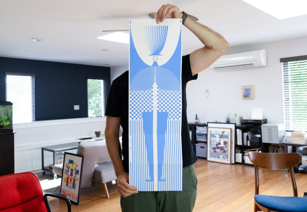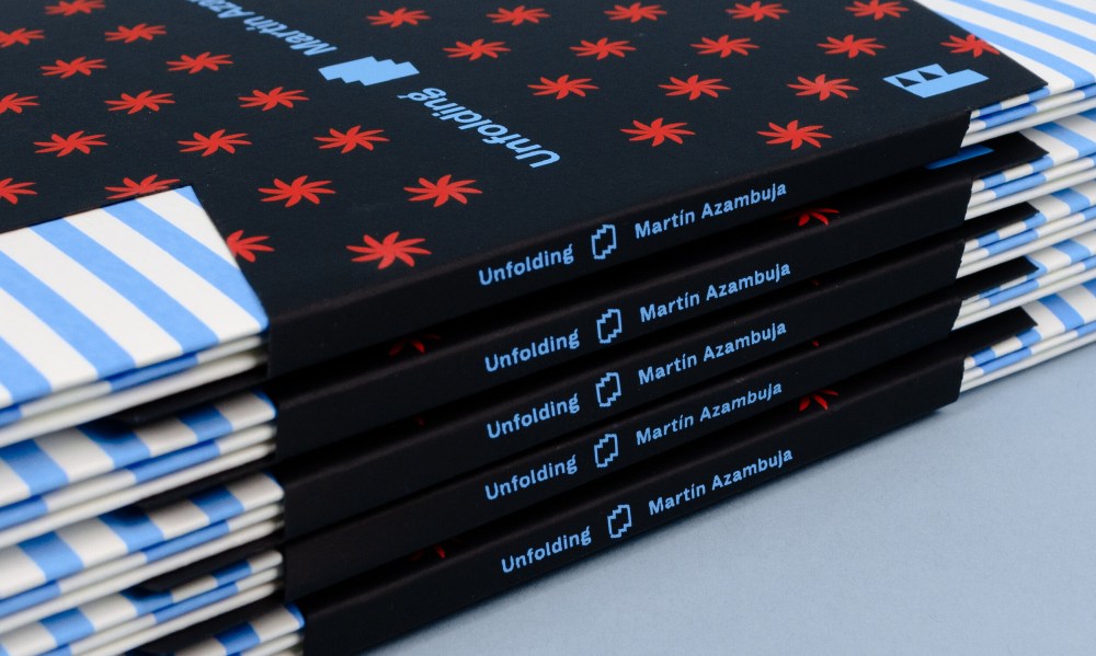 His new print above is part of the “Unfolding” series, a set of accordion prints from Flecha Books. “The artists are given this format, a folded problem/opportunity,” says Francisco Roca, who in 2018 co-founded the indie press with Leandro Castelao. “We like to think of it a bit like a portfolio piece, something that can capture the graphic essence of the person—as much as that can be done. … When viewers are confronted with these prints, they unfold the artist’s work, hopefully to a pleasing surprise.”
