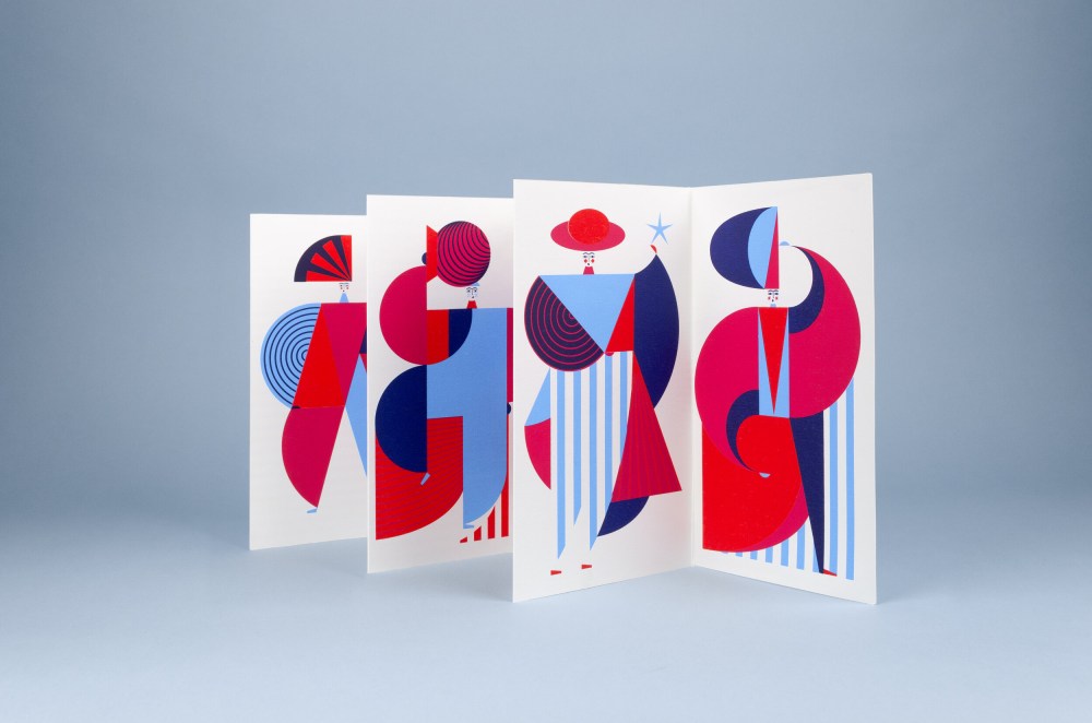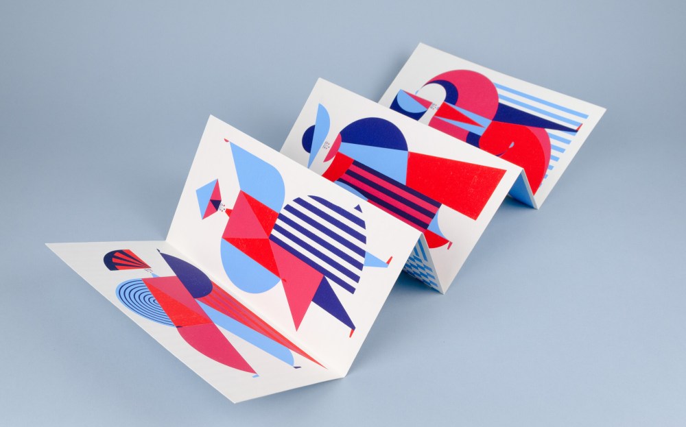 The images are hand-printed in silk, four inks on the front, one on the back. They can be kept closed in a library, unfolded on a shelf or framed on a wall.