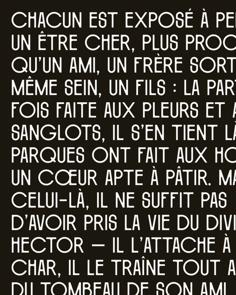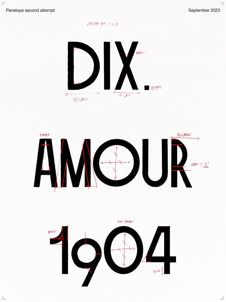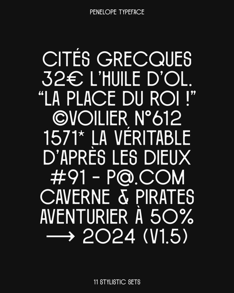 Penelope’s distinctive rhythm instantly caught my eye, vacillating between narrow and wide. Designed by Lyon-based Timothée Berger, the display typeface’s streamlined, imposing letterforms evoke Art Deco, while slight irregularities and sinuous joints give it an Art Nouveau vibe.